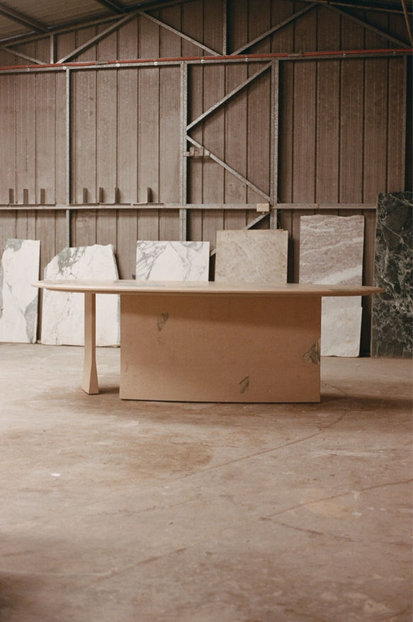 A customised banquette table shaped to the dining space in sand tinted concrete and various green marble fragments.